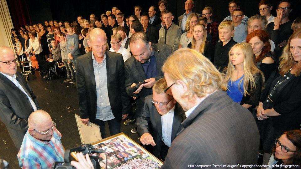 Auf der großen Leinwand hatten sich zuvor alle Komparsen zum ersten Mal gesehen. Bisher kannten sie lediglich "ihre" Szenen und damit Fragmente des Dramas, aus denen das große Ganze geworden ist. "Ein wunderbarer Film, total emotional, sehr bewegend", urteilten die meisten Komparsen. Michael Kurzius war auch eine halbe Stunde nach dem Film noch sichtlich ergriffen: "Ich muss das erstmal sacken lassen." Kurz davor hatte er Regisseur Kai Wessel noch zwei große Bilderrahmen mit Porträtfotos aller Komparsen und Schauspieler als Erinnerung überreicht.